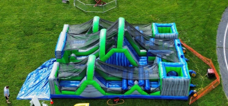 Prepare for the ultimate challenge with the Gladiator Quest Extreme Obstacle Course. This massive inflatable is designed to push participants to their limits with a series of intense obstacles, towering climbs, and thrilling slides. Featuring a rugged adventure-inspired design with bold green, blue, and gray elements, this course creates the perfect setting for head-to-head competition.