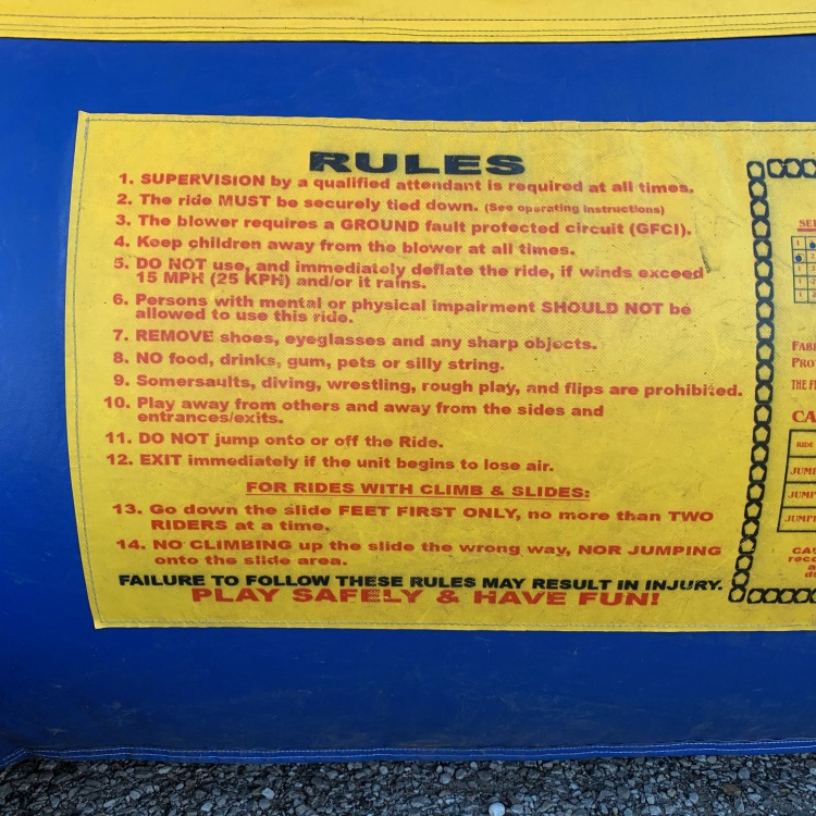 - OCCUPANCY: A maximum of 5-6 kids of equal size at one time for bounce houses, and 1 person at a time for slides is what most inflatable manufacturers recommend.